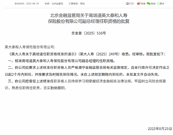 8月29日金融一线音尘,北京金融监管局发布对于高培说念英大泰和东说念主寿保障股份有限公司副总司理任职履历的批复,核准高培说念英大泰和东说念主寿保障股份有限公司副总司理的任职履历。