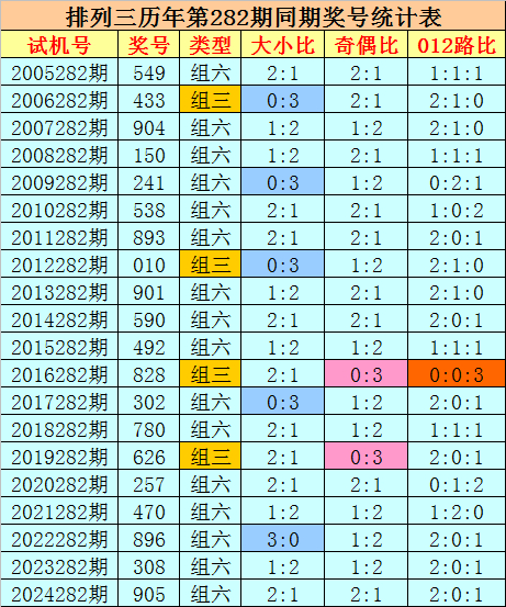 组选类型保举:历史上成列三第282期同时奖号中,组六出现16期,组三出现4次,本年第282期展望奖号为组六号码。